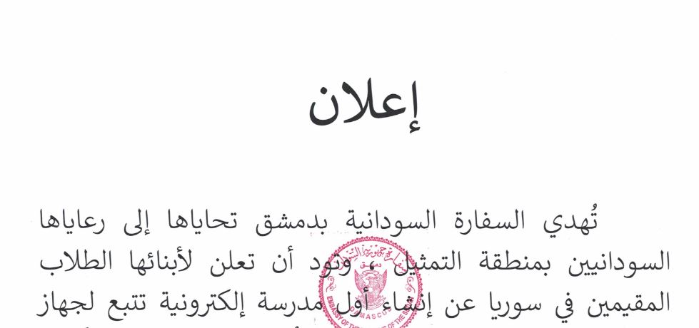 تهدي السفارة السودانية بدمشق تحاياها إلى رعاياها السودانيين بمنطقة التمثيل ، وتود أن تعلن لأبنائها الطلاب المقيمين في سوريا عن إنشاء أول مدرسة إلكترونية تتبع لجهاز تنظيم شؤون السودانيين بالخارج ، وترفق السفارة مختصرا عن المدرسة وشروط وكيفية التسجيل فيها