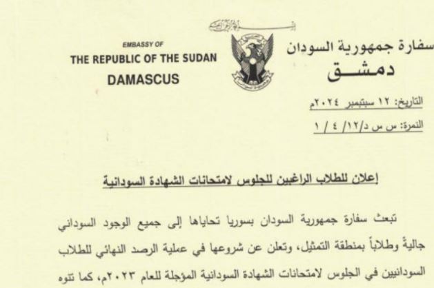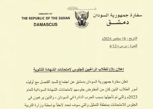 إعلان مهم تبعث سفارة جمهورية السودان بدمشق بتحاياها إلى كل الوجود السوداني بمنطقة التمثيل وبالإشارة إلى إعلانيها السابقين بتاريخ12 سبتمبر 2024م و 16 سبتمبر 2024م بخصوص امتحانات الشهادة السودانية للعام ٢٠٢٣م المؤجلة، تود التنويه إلى أن وزارة التربية والتعليم قد حددت بأن يوم الأحد الموافق ١٧ نوفمبر ٢٠٢٤م باعتباره اليوم الأخير لعمليات الرصد والحصر والتسجيل للراغبين في الجلوس للامتحانات. عليه تناشد السفارة كل الطلاب السودانيين المستوفين للشروط الموضحة في أوقات سابقة الإسراع بمراجعة السفارة السودانية بدمشق لإكمال عملية التسجيل حتى يتسنى للسفارة إفادة وزارة التربية والتعليم بذلك